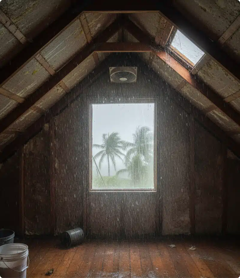 Humidity and poor attic ventilation create conditions where mold and wood rot develop in the roof deck and framing. Left unchecked, biological growth degrades the substrate that roofing materials depend on for structural integrity.