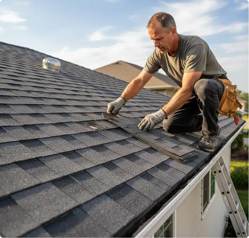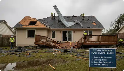 Storm damage repair includes all the work needed after hurricanes and tropical storms, such as replacing shingles, fixing decking, restoring ridge caps, and rebuilding sections when wind or debris has damaged the structure. Full steps for addressing storm damage are detailed in the storm damage roof repair guide.