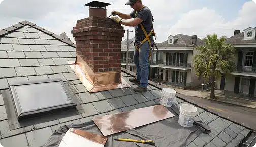 Flashing repair covers the metal seals around chimneys, skylights, pipe vents, and roof valleys. Failed flashing is the single most common cause of roof leaks in New Orleans homes. The roof flashing repair service includes full removal, replacement, and resealing of all compromised transition points.